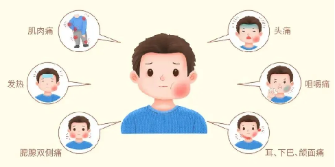 主要症状:本病大多数起病较急,有发热、畏寒、头痛、咽痛等全身不适症状。患者一侧或双侧耳下腮腺肿大、疼痛,咀嚼时更痛。并发症有脑膜炎、心肌炎等。整个病程约7~12天。