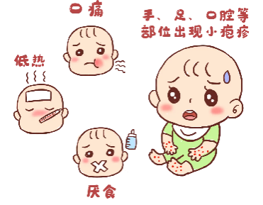 主要症状:先出现发烧症状,手心、脚心出现斑丘疹和疱疹(疹子周围可发红),口腔粘膜出现疱疹或溃疡,疼痛明显。部分患者可伴有咳嗽、流涕、食欲不振、恶心、呕吐和头疼等症状。少数患者病情较重,可并发脑炎、脑膜炎、心肌炎、肺炎等。