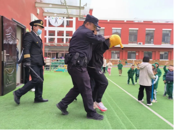 户外活动时,老师带领幼儿正在进行游戏。一名“持刀歹徒”进入园区。安全管理人员第一时间启动应急机制,迅速报警,出警民警与学院安全保卫处迅速赶到现场,组织人员合围”歹徒“,一番”搏斗“后,“歹徒”被控制抓获。