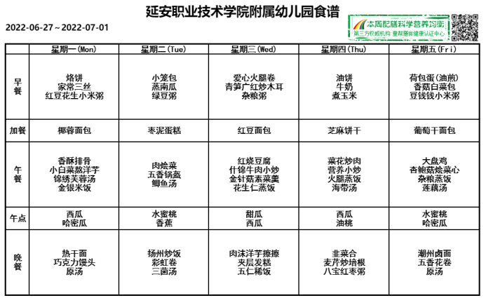 延安职业技术学院附属幼儿园第十九周食谱2022.06.27--2022.07.01