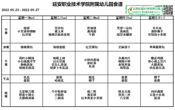 延安职业技术学院附属幼儿园第十四周食谱2022.05.23--2022.05.27