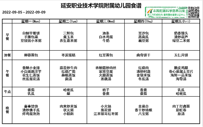 延安职业技术学院附属幼儿园第一周食谱2022.09.05--2022.09.09