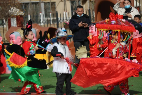 大班组的孩子们在伞头的率领下,踏着铿锵的锣鼓,和着嘹亮的唢呐尽情欢舞。