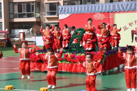 花车上是由小一班幼儿装扮的十二生肖、年画娃娃等,以姹紫嫣红的花海为衬托,满载着喜庆与吉祥,寓意风调雨顺、五谷丰登。