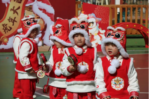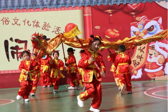 伴随着锣鼓升腾、热闹喜庆的音乐,中四班孩子们或左右摆动,或上下起舞,一招一式憨态可掬,民俗表演在孩子们的演绎中重焕生机。