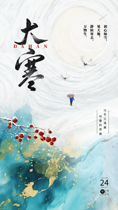 大寒是二十四节气中的最后一个节气,是每年公历1月20日或21日,处在三九、四九时段,冰天雪地的严寒景象为大寒。大寒节气表示一年当中最寒冷的时候来到了,冬去春来,大寒到也预示着新的一年的开始。
